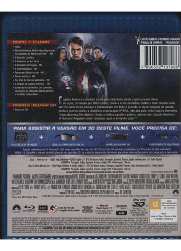 Capitão América comanda a luta pela liberdade, neste supersucesso cheio de ação, estrelado por Chris Evans, como a arma definitiva contra o mal! Quando uma aterrorizante força ameaça a humanidade em todo o planeta, o maior soldado do mundo declara guerra contra a diabólica organização HYDRA, liderada pelo vilão Caveira Vermelha (Hugo Weaving, Matrix). Tanto a crítica quanto o público aclamaram Capitão América - O Primeiro Vingador como 'emoção, ação e diversão pura!' * *Bryan Erdy, CBS-TV/Movie Planet.