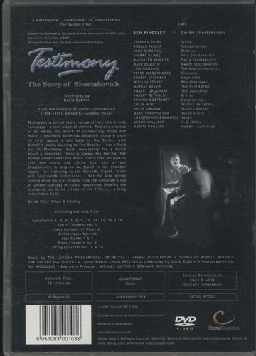 Testimony is one of those comparatively rare events nowadays - a real piece of cinema. Palmer's prowess as an editor, his knack of juxtaposing image and music - something which has remained his forte since he first caused a stir back in the sixties with Buddhist monks burning to The Beatles - has a field day in Testimony. Most importantly for a movie about a composer, there is always the feeling that Palmer understands the music. For a start, he puts to rest the hoary old cliche´ that the private Shostakovich is only to be found in his chamber music - try listening to the Seventh, Eighth, Ninth and Fourteenth symphonies - but he also brings vividly alive musical details (like the composer's use of unison scoring) in colour sequences showing the orchestra, as in the climax of the Fifth ... a truly remarkable film