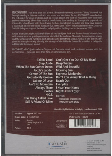 Incognito - far more than just a band. The sound visionary Jean-Paul "Bluey" Maunick has been pioneering in the mercurial acid jazz scene, and as a talent factory, Incognito has rolled out the red carpet for vocal prodigies, such as Jocelyn Brown and the best musicians from the British groove community. Short-lived musical trends have done nothing to damage the popularity of this multi-cultural band with their driving rhythms and elegant melodies and they have become a trademark all over the world, especially live. In this vein, "Bluey" Maunick celebrated Incognito's 30th birthday on stage at the London INDIGO2 with a thrilling concert in summer 2009. It was a fantastic night: with their blend of soul and jazz, funk and fusion almost 30 musicians, with several surprise guest appearances, electrified the audience. Thanks to the contagious energy and the virtuoso solo numbers, each song became something special. And as if this band hadn't given us enough variety already, the strings of the Millenia Ensemble provided a delightful additional interplay of sound. Incognito didn't just celebrate 30 years of first-rate music and continued success with this performance - they also gave their fans an unforgettable gift. Track list 1. Talkin' Loud 2. Step Aside 3. When The Sun Comes Down 4. Jacob's Ladder 5. Centre Of The Sun 6. Get Into My Groove 7. Labour Of Love 8. Ain't No Mountain 9. Always There 10. Colibri 11. N.O.T. 12. This Thing Called Love 13. Still A Friend Of Mine 14. Can't Get You Out Of My Head 15. Deep Waters 16. Wild And Peaceful 17. Morning Sun 18. Expresso Madureira 19. Don't You Worry 'Bout A Thing 20. Reach Out 21. Everyday 22. I Hear Your Name 23. Nights Over Egypt