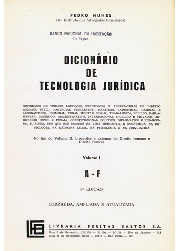 Indice: Volumes da Obra: Dicionário de Tecnologia Jurídica - Volume 1 - A-F 465 Páginas Dicionário de Tecnologia Jurídica - Volume 2 - G-Z - 472 à 956 Páginas
