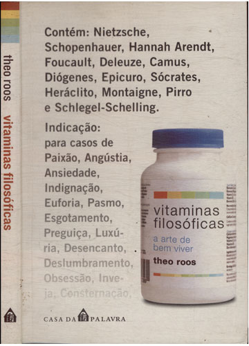 Filosofia sem contra-indicação. Com pílulas aplicáveis no dia-a-dia, essas 'Vitaminas filosóficas' fazem efeito e trazem sabedoria, liberdade e autoconhecimento. Nada melhor que Nietzsche, Camus, Foucault, Sócrates, Deleuze, Hanna Arendt e companhia para casos de paixão, ansiedade, preguiça, angústia. Tudo isso somado a letras de músicas de ídolos do rock e do pop, como Bob Dylan, Rolling Stones, Nirvana, David Bowie, Madonna. Este livro é produto da série de comportamento homônima, coordenada pelo jornalista Theo Roos e sucesso de crítica e público na emissora de TV alemã 3sat. 'Vitaminas filosóficas - A arte de bem viver' traz na embalagem apenas uma advertência - 'Filosofia faz bem à saúde'.