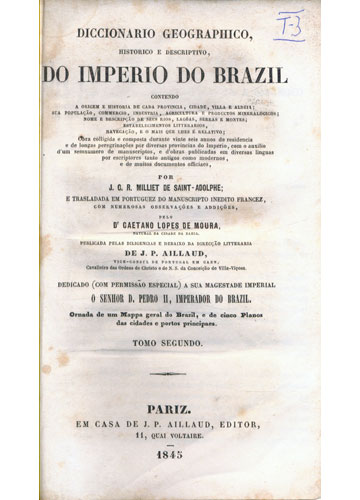 Originalmente publicado em 2 tomos pelo militar francês Milliet de Saint-Adolphe, o Diccionario Geographico do Brazil é uma das primeiras obras a ultrapassar o recorte provincial e oferecer uma descrição geral de todo o Império brasileiro, fornecendo um panorama do estágio de desenvolvimento de cada província, cidade, vila e aldeia do país. No âmbito da geografia, traz o nome e a descrição dos rios, lagoas, serras e montes.