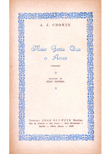 Curiosidades: Volumes: Mais Forte Que o Amor - 474 Páginas Almas em Conflito - 283 Páginas Anos de Tormenta - 298 Páginas Anos de Ternura - 359 Páginas A Dama dos Cravos - 261 Páginas As Chaves do Reino - 374 Páginas A Cidadela - 433 Páginas Sob a Luz das Estrêlas - 582 Páginas Noites de Vigília - 294 Páginas Encontro de Amor - 310 Páginas O Castelo do Homem sem Alma - 539 Páginas Os Deuses Riem - 204 Páginas Pelos Caminhos de Minha Vida - 382 PáginasTrês Amores - 456 Páginas Uma Estranha Mulher - 215 Páginas Algemas Partidas - 358 Páginas