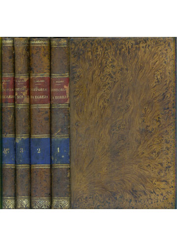 Curiosidades: Vol. 1: fissura e rasgo vertical na folha de guarda frontal (com anotações à caneta e a lápis no verso); assinatura de propriedade e marcação a carimbo na página de rosto; dano à junção e à costura (despregamento) na parte inferior provocado por traças; marcação a carimbo na folha de guarda traseira. Vol. 2: anotações de estudo a lápis e à caneta na folha de guarda frontal; anotações de estudo a lápis e à caneta (com perfuração da folha) e marcações a carimbo na página de rosto; marcação a carimbo na folha de guarda traseira; microfuros na região da borda lateral. Vol. 3: anotações na folha de guarda, marcações a carimbo na página de rosto e na folha de guarda traseira; furos de bichos na borda inferior (sem prejuízo ao texto). Vol. 4: idem vol. 3 + mutilação do canto inferior da página 21/22, com prejuízo às notas de rodapé (frente e verso).